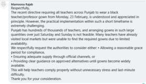 چند اساتذہ نے مانگ کی کہ گاؤن حکومتی سطح پر فراہم کئے جائیں یا اساتذہ کی تنخواہوں میں گاؤن الاؤنس بھی شامل کیا جائے۔